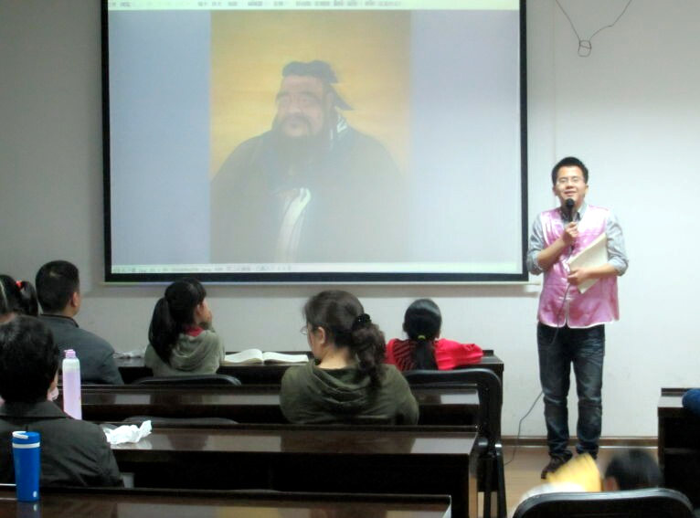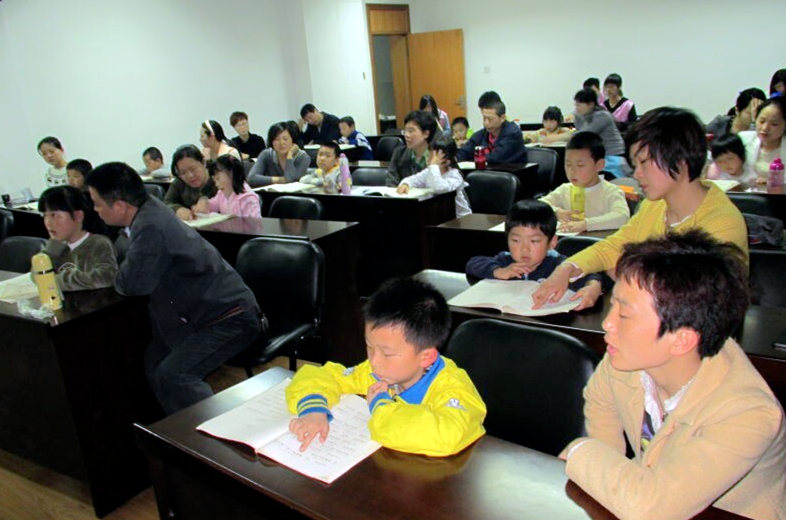 答:我们有一个主持人,每一堂课都是三十分钟。在课前组织大家对孔子像行三鞠躬礼。这既是对中华传统文化的尊重又是大家心静的过程。第一堂课的主要内容是诵读,老师在上面带读,小朋友大朋友在下面跟读,内容一般比较简单,如《弟子规》、《孝经》等。在这个过程中也有互动,比如大朋友带小朋友、小朋友带大朋友读,互换角色。第二节课是诵读唐诗三百首中精选的篇章。第三节课的内容会深刻一些,讲解《论语》、《老子》等。第四堂课是生命教育课,有关健康饮食、环保、励志、行孝故事等。这堂课是我们共读经典的亮点,很多亲子观念的改变都得益于这堂课。
